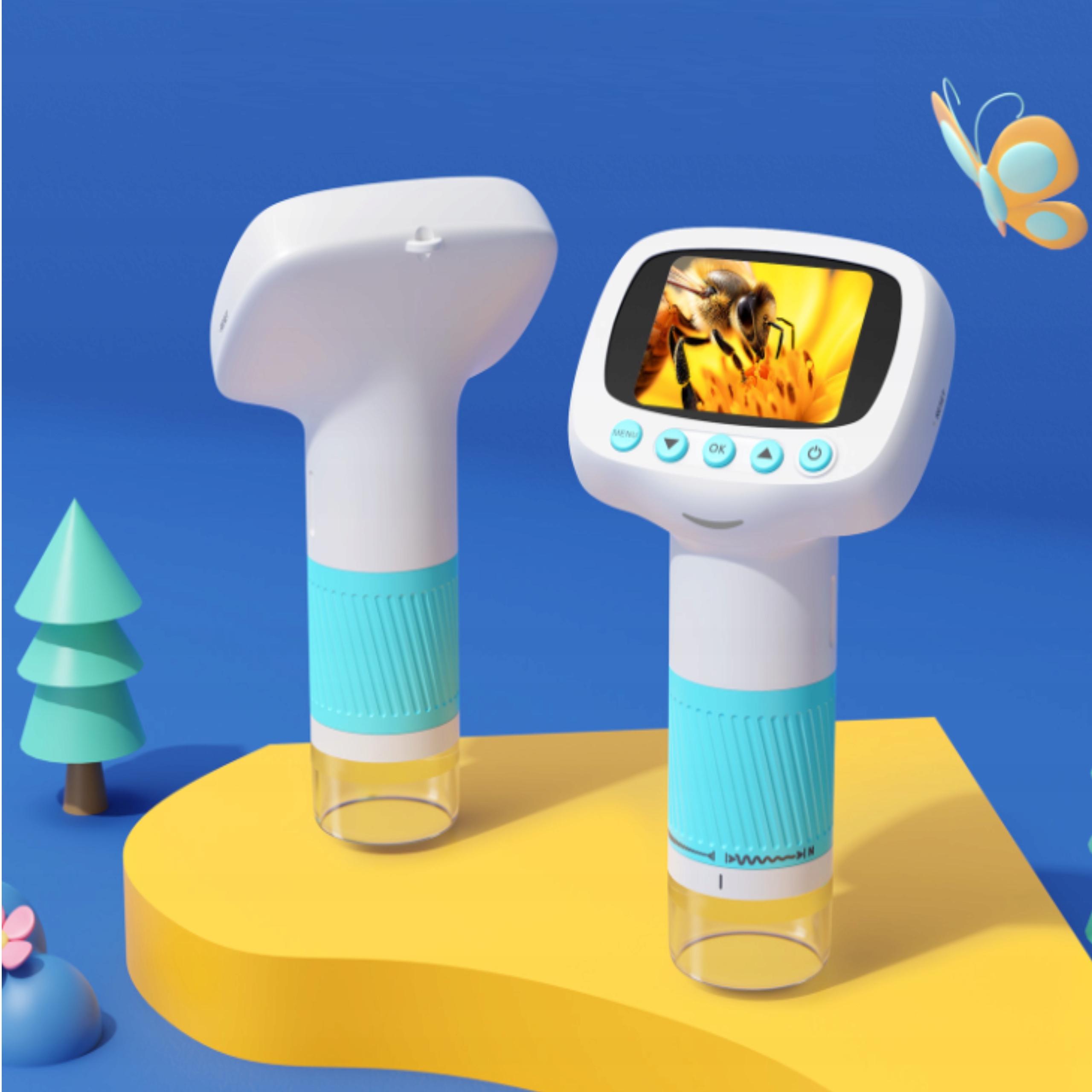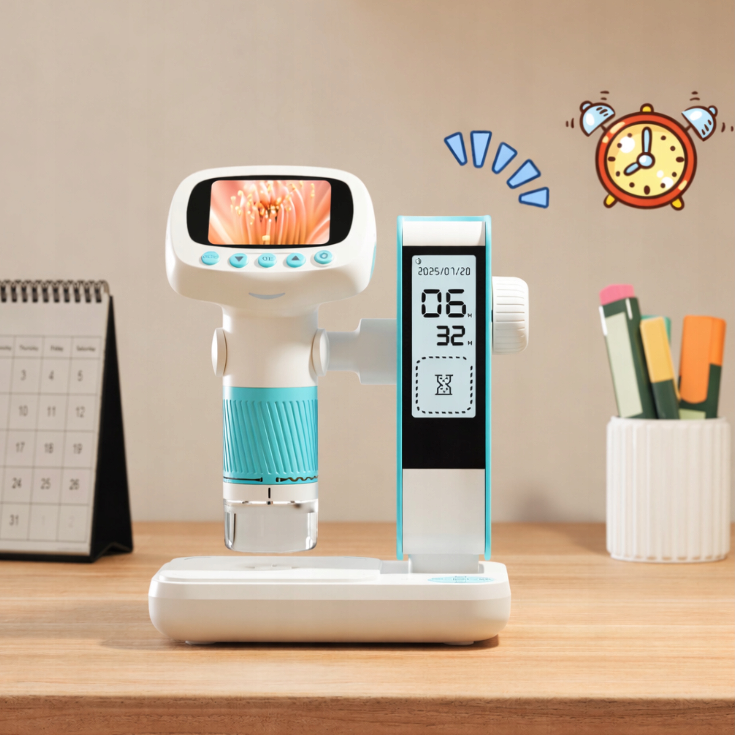 Urządzenie pozwala dziecku poznawać mikroświat w ciekawy i angażujący sposób, jednocześnie ucząc planowania czasu i samodzielności. Dzięki przyjaznemu, „robotycznemu” designowi mikroskop nie trafia do szuflady – staje się stałym elementem pokoju dziecka.